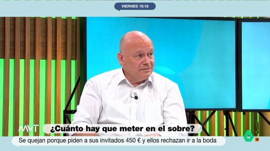 Por ello, en Más Vale Tarde debaten sobre cuánto dinero hay que meter en el sobre de una boda. Si es un amigo, Loreto Ochando asegura en el vídeo sobre estas líneas que pone "200 euros", mientras que Gabriel Sanz opina que "tienes que meter como mínimo el cubierto".