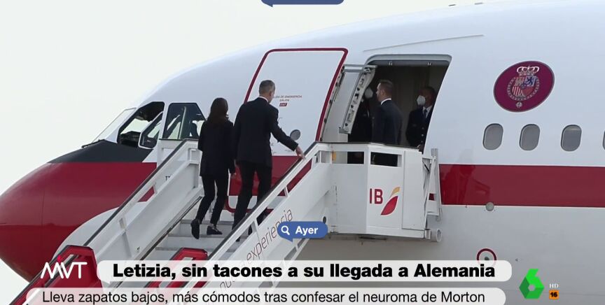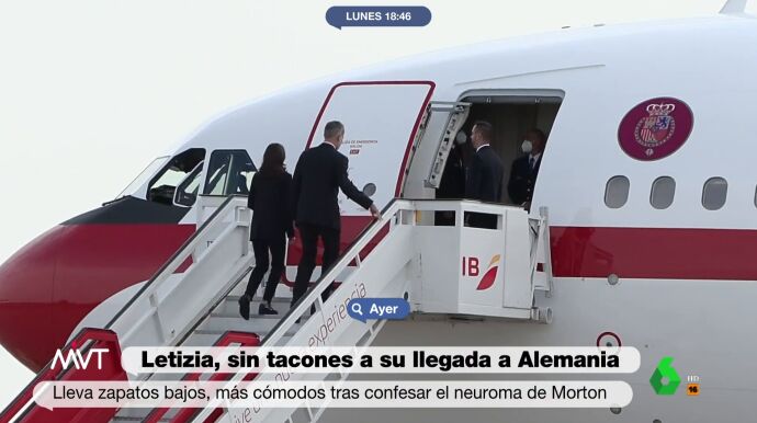 Así, Letizia lucía este domingo un zapato plano a su llegada a Alemania, aunque escasas horas después ha vuelto a calzarse unos zapatos de tacón, tal y como puede verse en el vídeo que ilustra estas líneas.