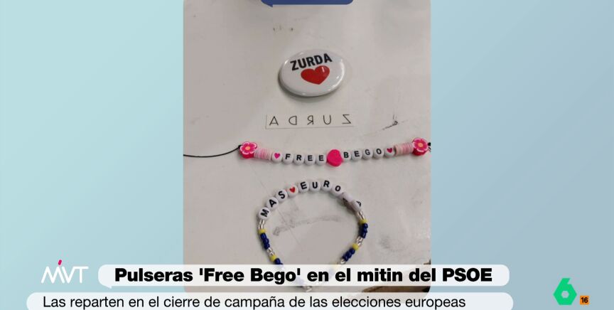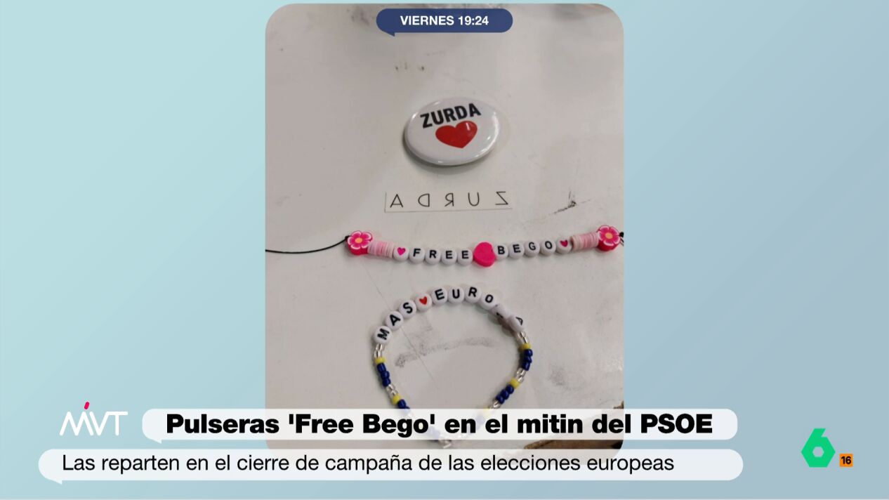 El 'merchandising' de los socialistas en el acto de fin de campaña para las elecciones europeas ha contado con pulseras dando apoyo a Begoña Gómez con lemas como 'Bego Free' o 'Love Bego'.