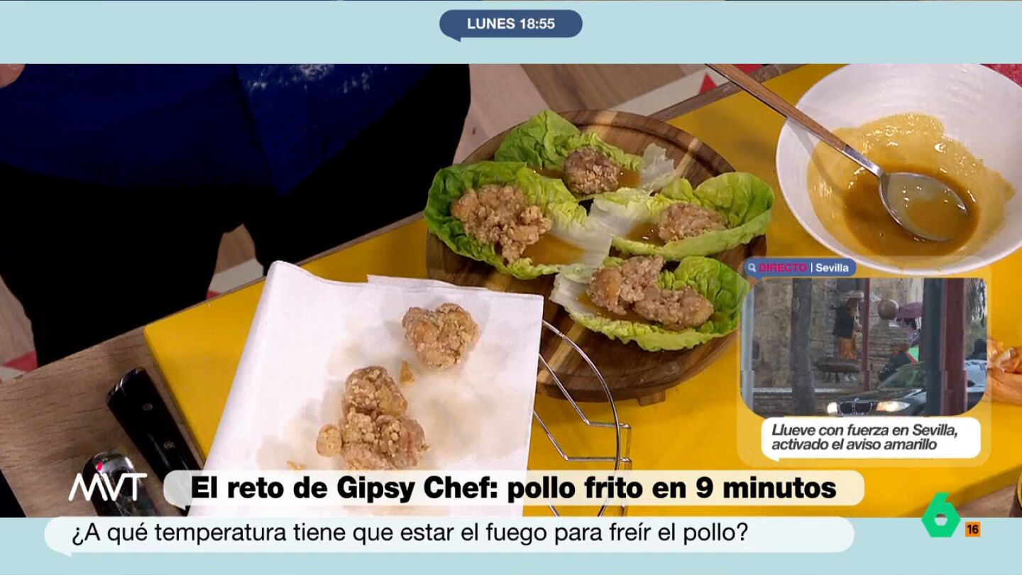 Nuestro Gipsy Chef se enfrenta al reto de conseguir preparar una receta de pollo frito en menos de 10 minutos. Y no vale hacer cualquier cosa, el chef deberá cumplir con esta original receta de pollo frito dejando la textura adecuada y el sabor deseado, ¿conseguirá el aprobado de Iñaki López y Cristina Pardo? ¿será capaz de tenerlo todo listo en el tiempo indicado? ¡No te pierdas el vídeo de la receta!