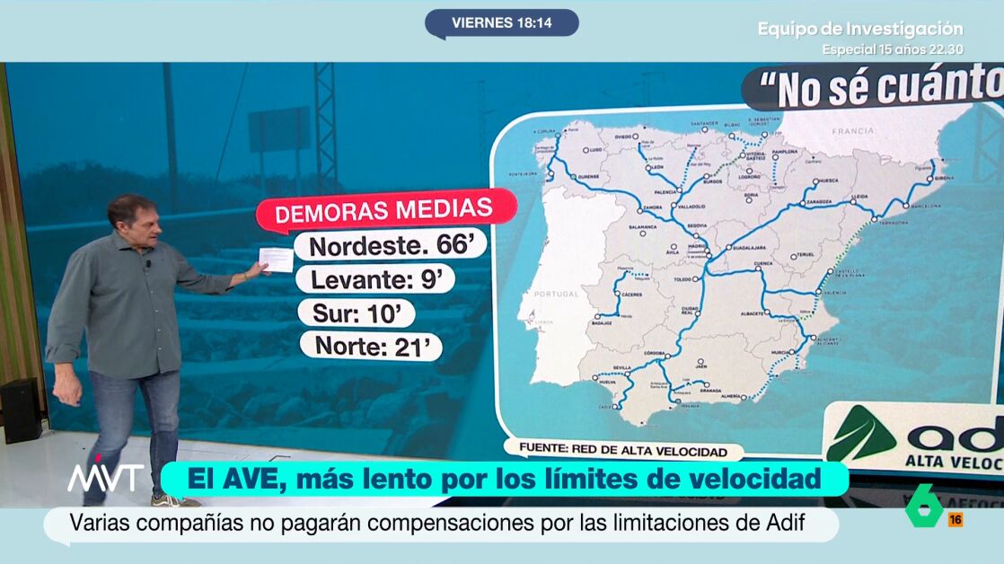 Renfe ha comunicado a laSexta, que los retrasos en las vías, aplicables a todas las compañías, son de: 66 minutos si se dirigen al este, nueve minutos si se va al corredor mediterráneo; diez en el caso del sur y 21 en el del norte. Sin embargo, estas cifras distan mucho de la realidad.