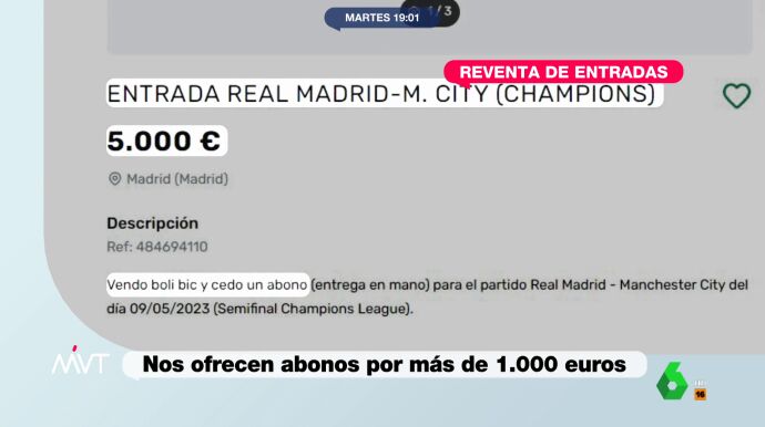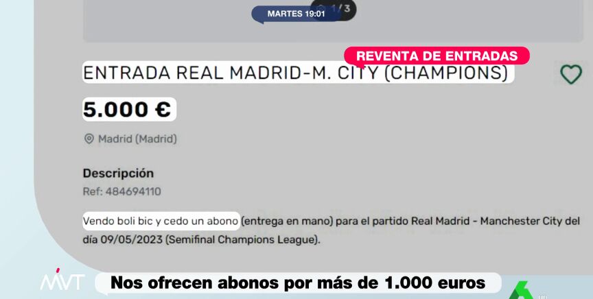 "Vendo boli bic y cedo un abono (entrega en mano) para el partido Real Madrid-Manchester City", señalaba una persona, que lo ponía a 5.000 euros. No está permitida la venta de abonos, por eso, venden bolígrafos. Otro usuario en otro anuncio pide 800 euros.