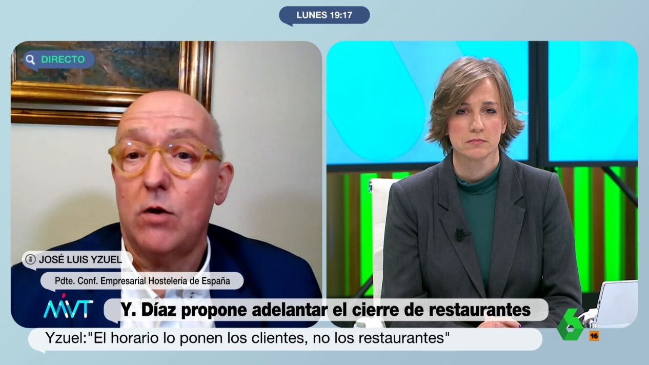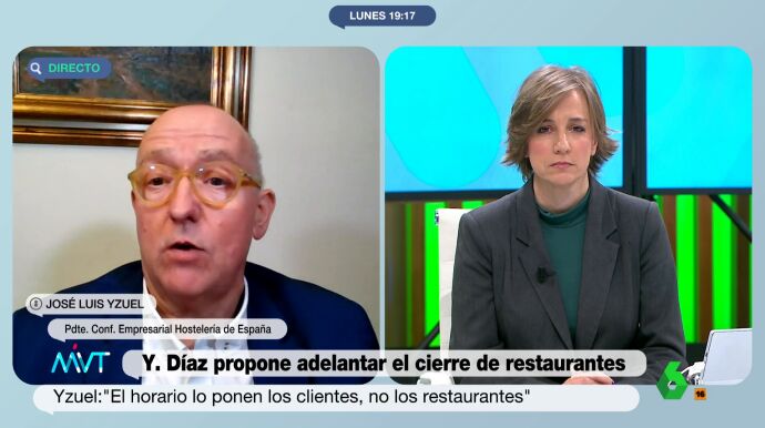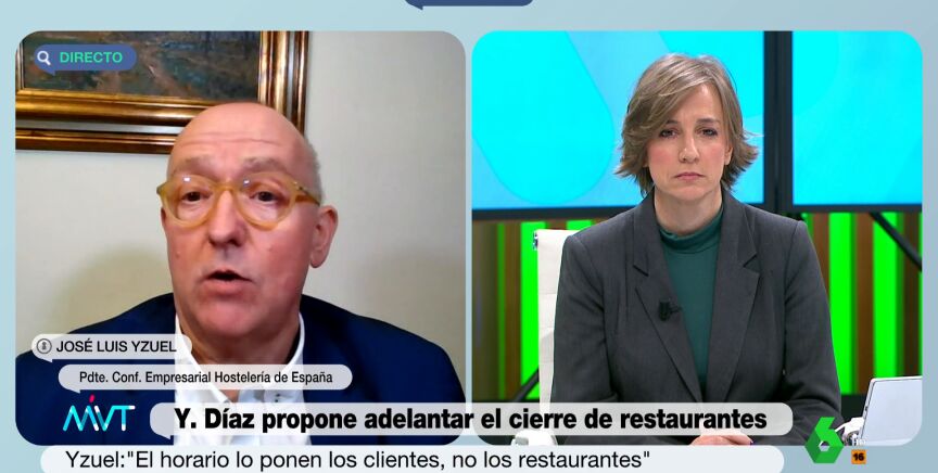 José Luis Yzuel, presidente de Hostelería, y Tania Sánchez han protagonizado un tenso debate en Más Vale Tarde por el horario de los restaurantes tras la propuesta de Yolanda Díaz para adelantar su cierre.