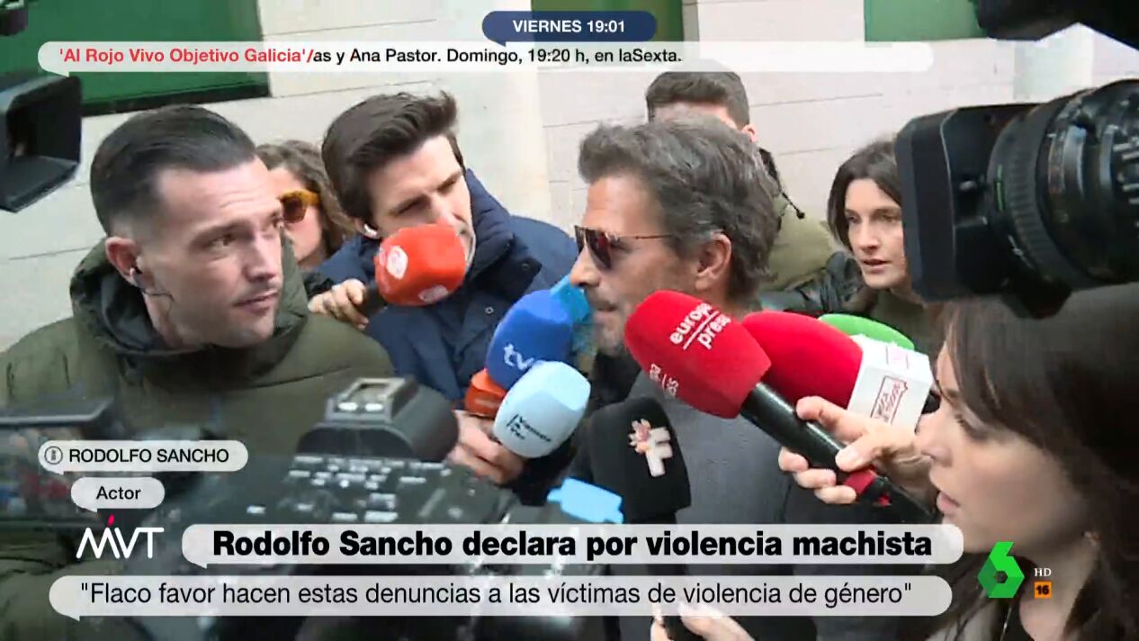 Rodolfo Sancho ha expresado este viernes antes de declarar en el juzgado de violencia de género de Alcobendas que está "muy enfadado" por la denuncia de su expareja Silvia Bronchalo. "Estoy muy enfadado con esto y flaco favor hacen este tipo de denuncias a las personas que de verdad sufren violencia de género", ha declarado ante los medios el actor y padre de Daniel Sancho.
