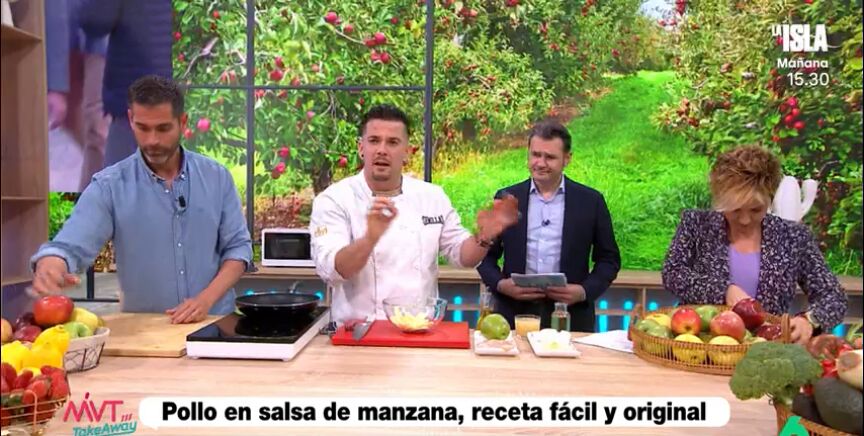 Para comenzar, Maldonado ha explicado cómo preparar una deliciosa salsa de manzana. En un cuenco, se colocan las manzanas troceadas junto con un toque de vino blanco, un chorro de aceite, un poco de caldo de pollo, sal y pimienta. Esta mezcla se cocina en el microondas durante cuatro minutos. Una vez lista, se tritura con la batidora hasta obtener una salsa suave y aromática.