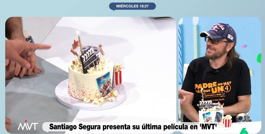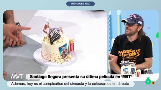 Además de que hoy es el día de estreno de 'Padre no hay más que uno 4: Campanas de boda', también es el cumpleaños de Santiago Segura. En su visita al plató de Más Vale Tarde, el programa sorprende al director con una tarta que trae el nutricionista Pablo Ojeda.