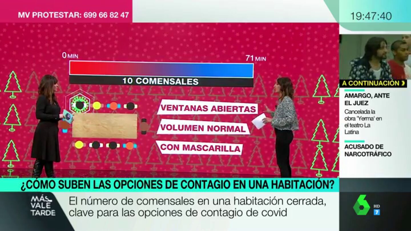 ¿Y si fuéramos seis comensales en vez de 10? Con las ventanas abiertas, mascarillas y volumen normal, tenemos dos horas para cenar con riesgo mínimo. Sin mascarilla, este tiempo se reduce a 21 minutos; 17 si tenemos las ventanas cerradas y solo 13 si hablamos alto.