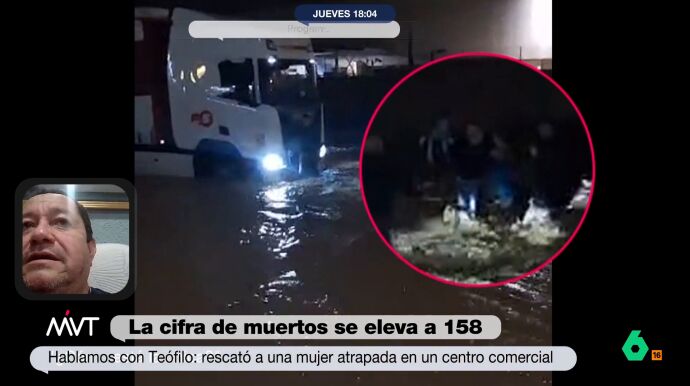 Uno de los héroes de la catástrofe causada por la DANA es Teófilo Cedeno, que consiguió rescatar a una mujer embarazada en un centro comercial. A pesar de la fuerza del agua, consiguió ayudar a esa mujer y llevarla a un lugar seguro. "No se lo pensó usted mucho", le dice Iñaki López, tras ver las angustiosas imágenes del rescate.