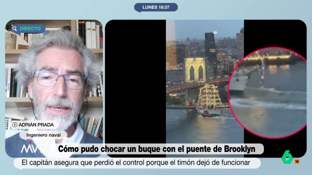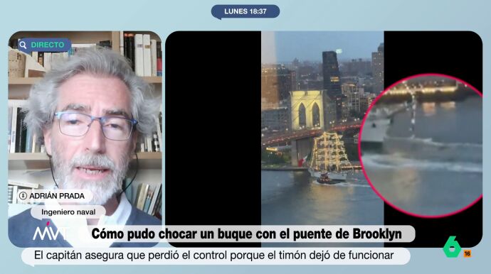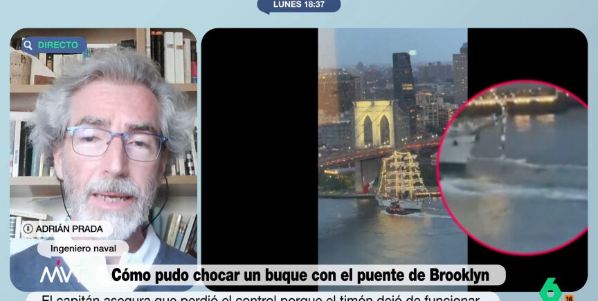 El ingeniero naval Adrián Prada ha analizado en Más Vale Tarde qué pudo pasar para que un buque escuela de la Armada de México chocara contra el Puente de Brooklyn este domingo, dejando dos muertos. En primer lugar, Prada ha aclarado que el buque "no estaba en solitario, sino que tenía un remolcador de apoyo, que le estaba ayudando con el rumbo para que el barco se pusiese en la dirección que necesitaba". En este sentido, el ingeniero ha subrayado que "le estaba ayudando con la maniobra", aunque ha apostillado que "hubiese sido deseable tener un segundo remolcador tirando para ayudar, pero no lo había".