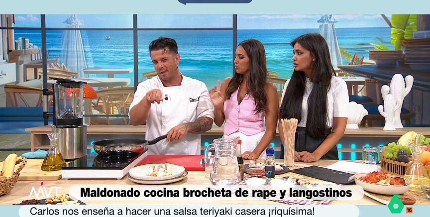 El chef Carlos Maldonado ha cocinado brochetas de langostinos y rape, glaseadas con salsa teriyaki y bañadas en salsa romesco. Para poder glasear las brochetas ha necesitado espesar la salsa teriyaki, ya que se encontraba en un estado muy líquido. Y para hacerlo tan sólo ha utilizado agua y almidón de maíz.