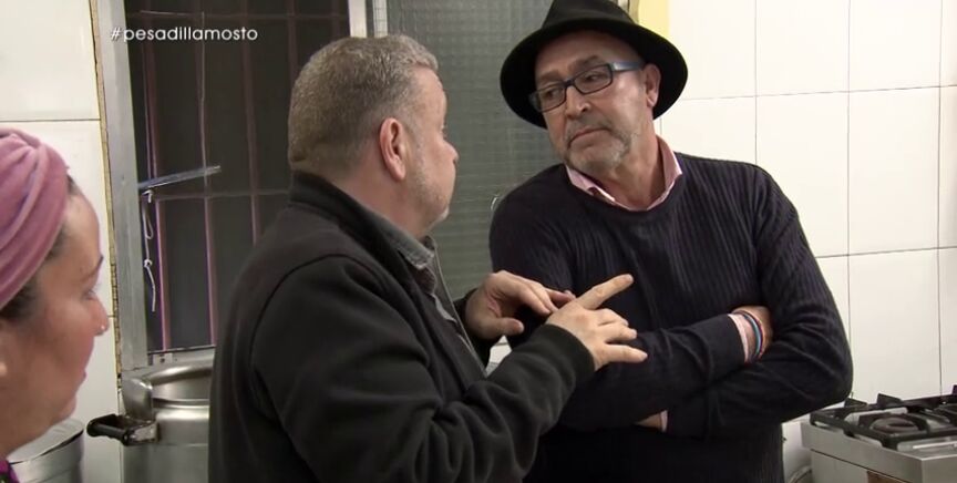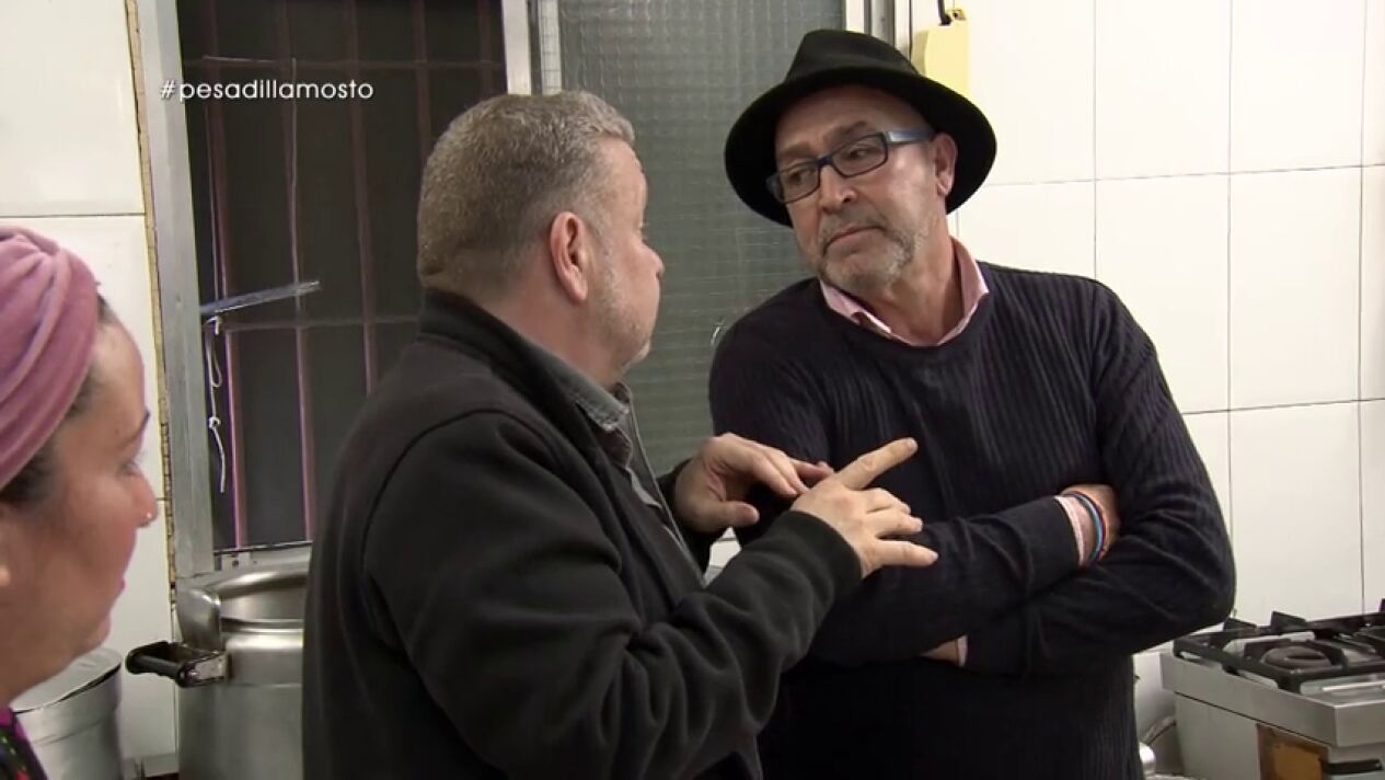 El propietario del 'Mosto Tejero', Juanete, y la jefa de cocina, María, le enseñan a Alberto Chicote 'los fogones'. Un lugar con una campana "cojonuda" en la que la grasa gotea y que tiene una regleta dentro. Un peligro del que alarma Chicote y que se toma a "coña" Juanete.