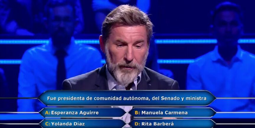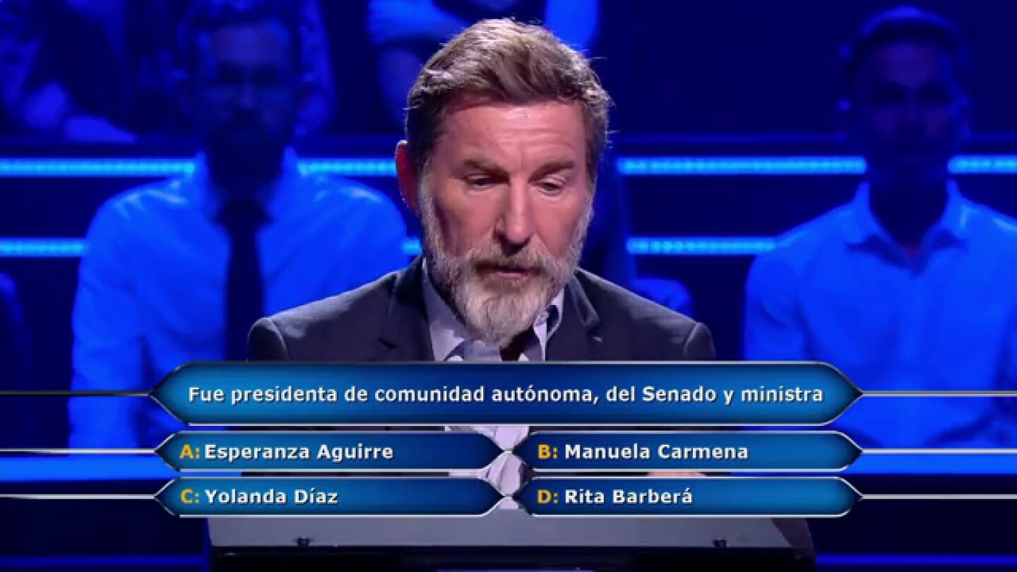 ¿Quién ha sido presidenta de una Comunidad Autónoma, del Senado y ministra: Esperanza Aguirre, Manuela Carmena, Yolanda Díaz o Rita Barberá? Esta es la respuesta del actor Antonio de la Torre en ¿Quién quiere ser millonario?