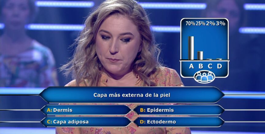 La ayuda deja en mal lugar al público y en bueno a la concursante, ya que, desvela que la opción correcta está entre la epidermis y la capa adiposa, y no en la dermis. "Tenía razón yo", comenta al ver el resultado y responde "'B', Dermis". "¡Qué rabia!", declara mientras espera para ver que ha acertado. "Te ha costado dos comodines, pero has ganado algo muy importante, confiar en lo que sabes", le dice Juanra Bonet para que valore positivamente lo ocurrido.