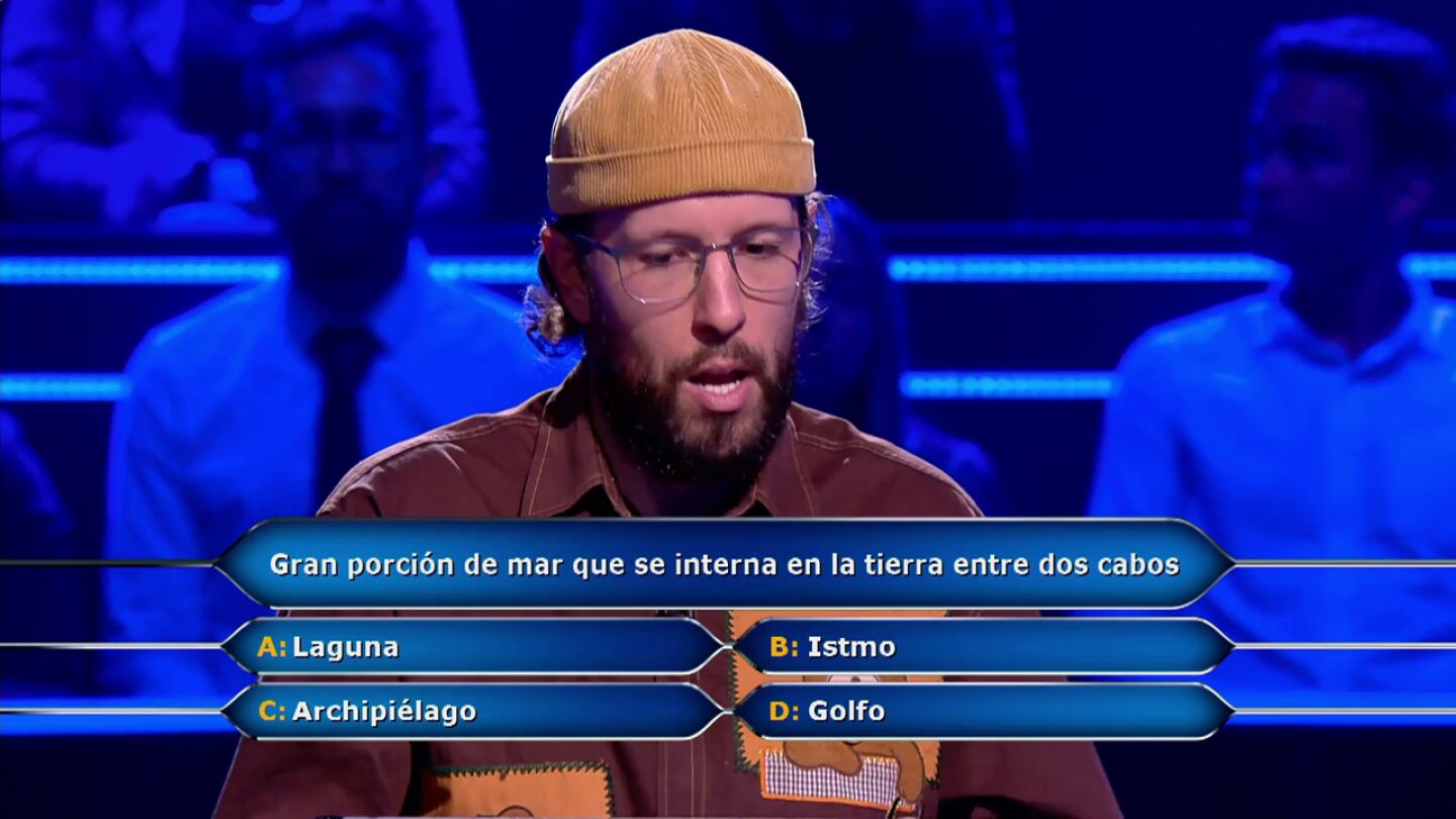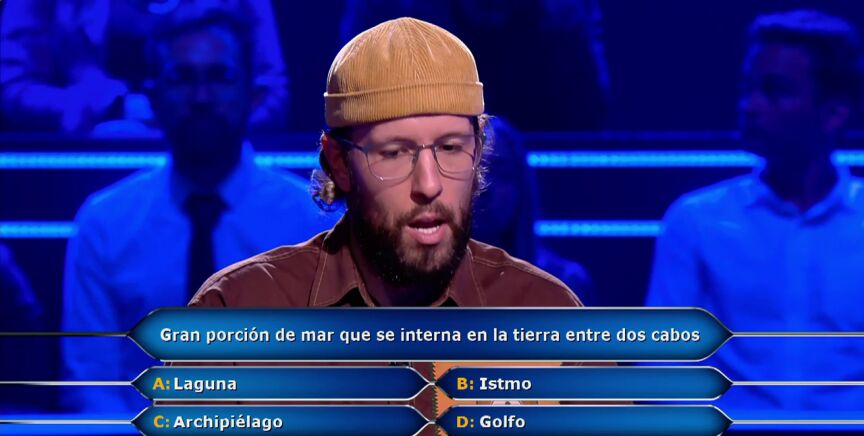 "¿Cómo se llama una gran porción de mar que se interna en la tierra entre dos cabos?", pregunta el presentador al concursante, al que da las siguientes opciones: Laguna, itsmo, archipiélago y golfo.