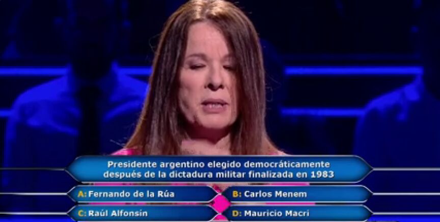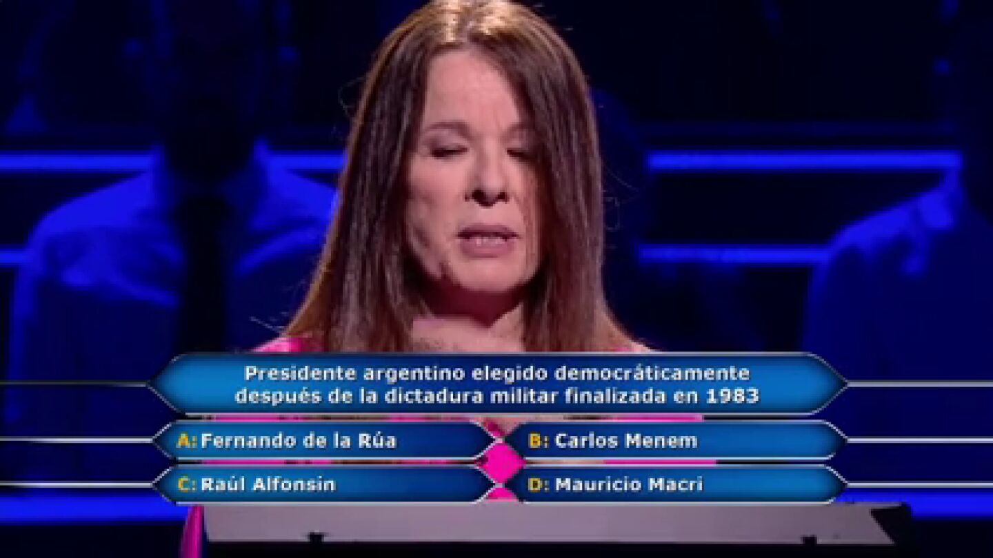 Sin comodines, Chitina Moreno Torres juega por 20.000 euros en la décima pregunta que le lanza Juanra Bonet: ¿Qué presidente argentino fue elegido democráticamente después de la dictadura militar finalizada en 1983? Fernando de la Rúa, Carlos Menem, Raúl Alfonsín o Mauricio Macri son las cuatro opciones que le ofrece el programa.