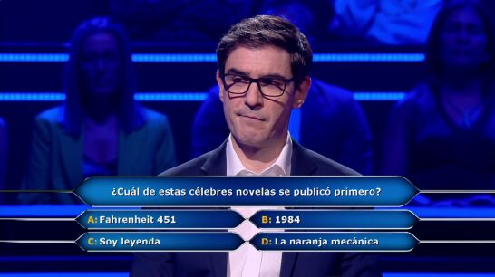 Jairo se la juega en este pregunta de ¿Quién quiere ser millonario? y no tiene ni idea de qué novela se publicó primero: 'Fahrenheit 451', '1984', 'Soy leyenda' o 'La naranja mecánica'. De su respuesta depende si continúa jugando o si, por el contrario, regresa a casa.