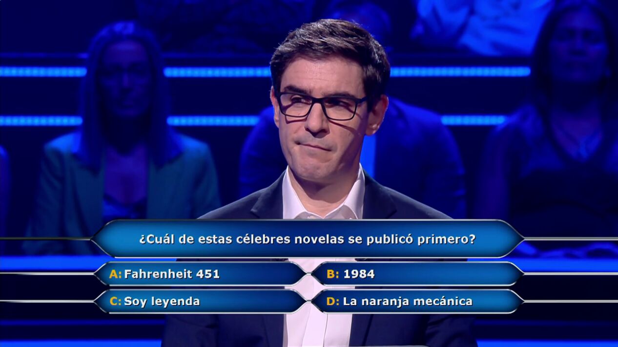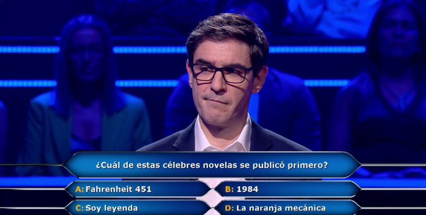 El concursante no ha leído ninguna de ellas, aunque sí las conoce. "A ver, la única que soy capaz de ubicar 100% cronológicamente es '1984', porque sé que la escribió George Orwell como crítica al régimen estalinista por los años 40, pero no sé si las otras siguieron su estela o si alguna la ha podido preceder", reflexiona.