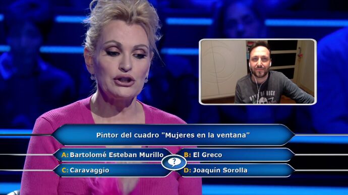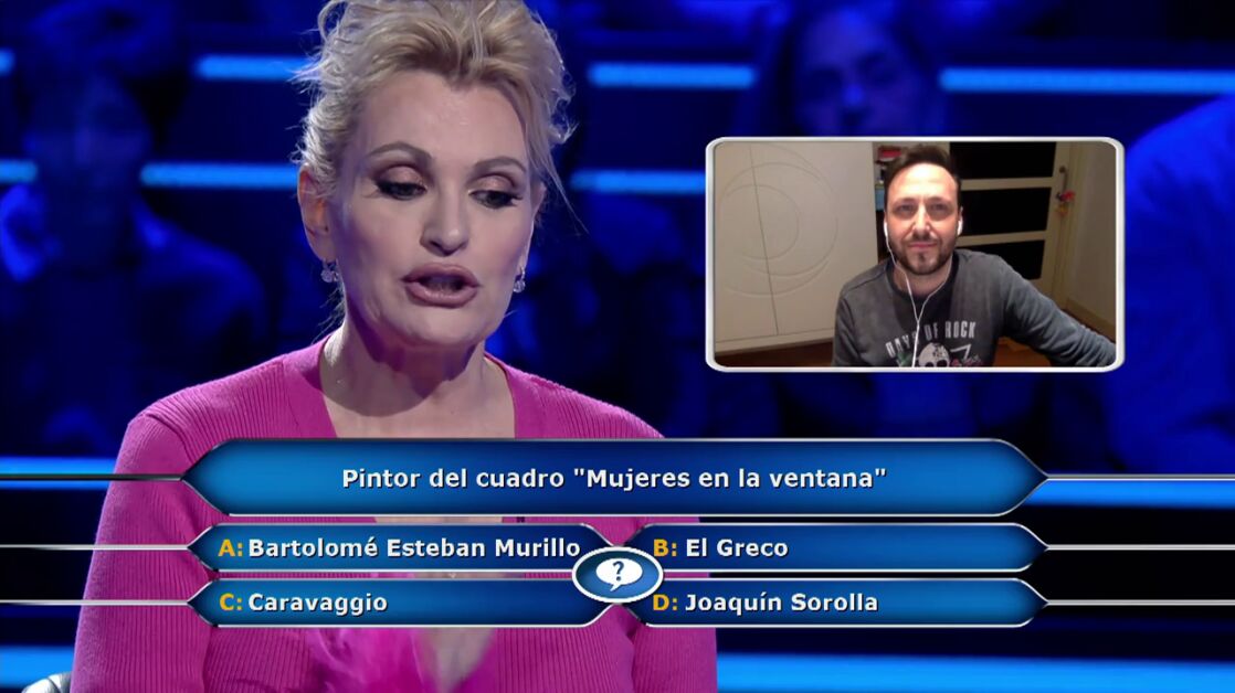 "Estoy nerviosa", expresa la soprano antes de encarar la pregunta diez por 20.000 euros y ganar el segundo seguro de ¿Quién quiere ser millonario?Juanra Bonet presenta el tema: "Pintor del cuadro 'Mujeres en la ventana': Bartolomé Esteban Murillo, El Greco, Caravaggio o Joaquín Sorolla".