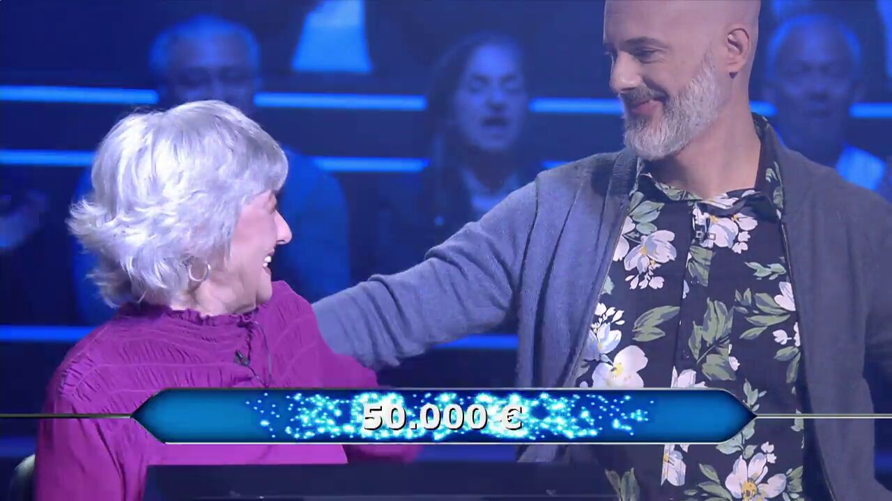 La aspirante al millón lee la pregunta y las respuesta a su ayudante. Sin pensarlo ni un segundo, el acompañante responde: "Yo no sé lo que hace este hombre en su tiempo libre, pero hace unos mangas fantásticos, hemos crecido con él". "No ves como sabe de esas cosas", le dice la concursante a Juanra y le confirma que marcan la 'A'. Se ilumina en verde la respuesta, han acertado.