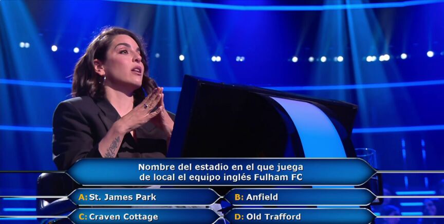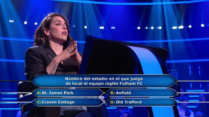 ¿Cómo se llama el estadio en el que juega de local el equipo inglés Fulham City? Esta pregunta, la sexta de la noche para Ruth Lorenzo, vale 2.500 euros y la oportunidad de seguir concursando en ¿Quién quiere ser millonario? para una buena causa.