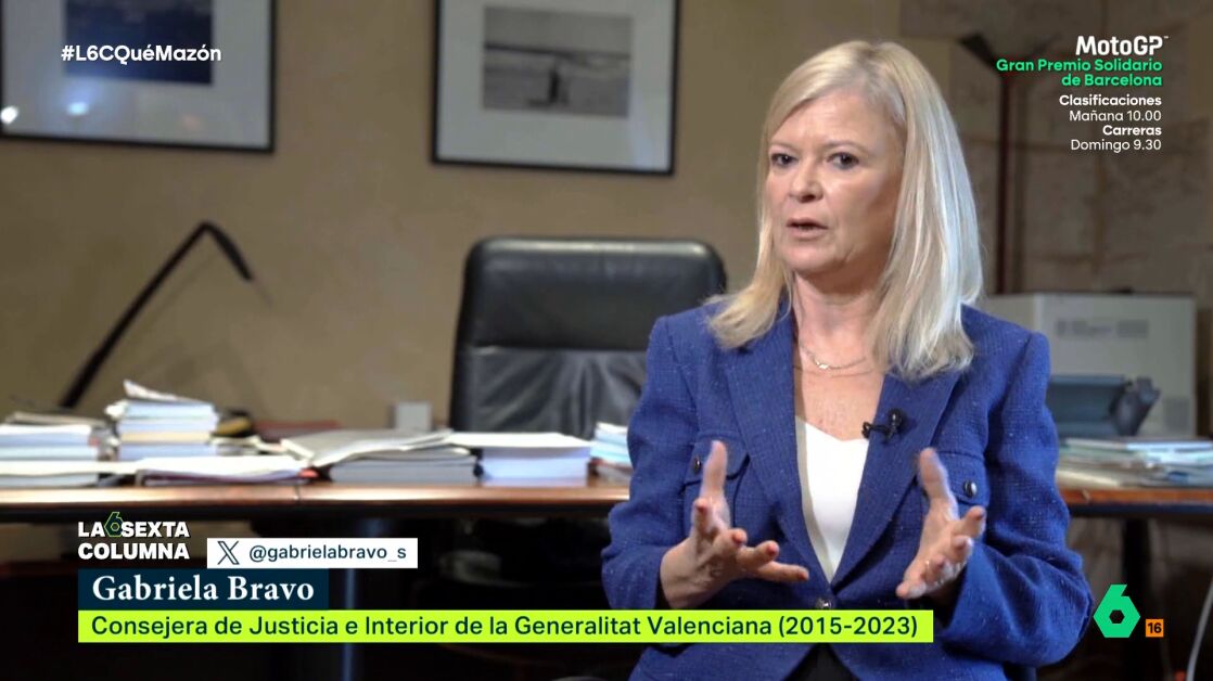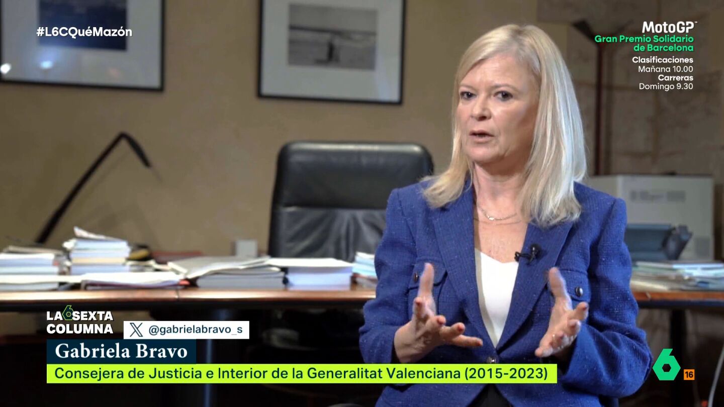 Gabriela Bravo tiene experiencia en lidiar con emergencias. De hecho, fue la consellera de Justicia e Interior durante el gobierno del socialista Ximo Puig. Asegura en esta entrevista con laSexta Columna que se trata de "la competencia más difícil, la que exige una mayor responsabilidad y dedicación".