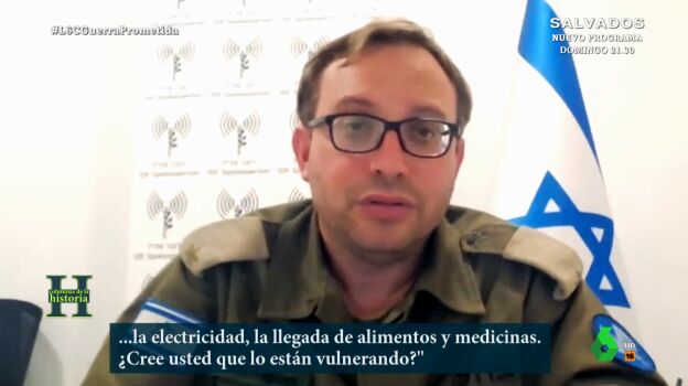 Respecto a si Israel está vulnerando el derecho internacional al cortar el agua y la electricidad en la franja de Gaza, así como impidiendo la llegada de alimentos y medicinas, el militar asegura rotundo que "no, porque nosotros le hemos solicitado a los civiles en el norte de la franja de Gaza que se evacuen hacia la zona del sur". "Israel en ese sentido no tiene obligación de dar medios a territorios enemigos, ni electricidad, ni agua. Hacemos todo lo que está dentro de nuestras posibilidades para maximizar el daño a los terroristas en la franja de Gaza y minimizar el daño a civiles, contra los cuales no tenemos absolutamente nada", sentencia.