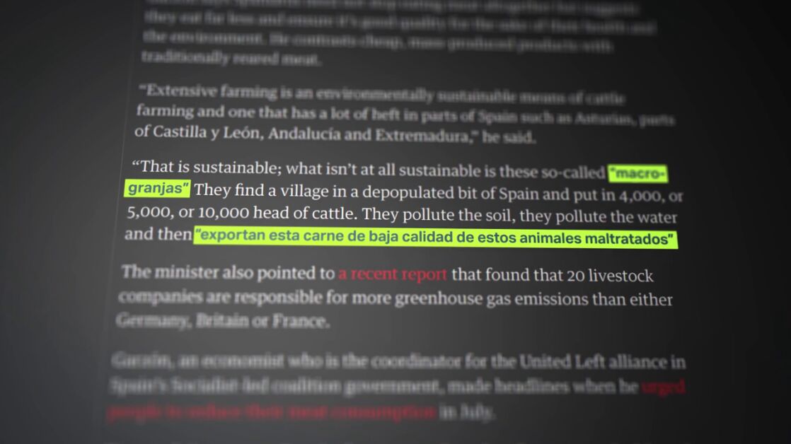 Se hacía eco de una noticia en una web de la industria cárnica, con el titular "Garzón afirma en The Guardian que España exporta carne de mala calidad". Sin embargo, eso no fue exactamente lo que dijo el ministro al rotativo británico, en una entrevista publicada sin grandes repercusiones una semana antes de que estallara la polémica: lo que dijo fue que las macrogranajas exportan carne de baja calidad de animales maltratados. Daba igual: Garzón recibió un sinfín de críticas por parte de la oposición y también desde el PSOE.
