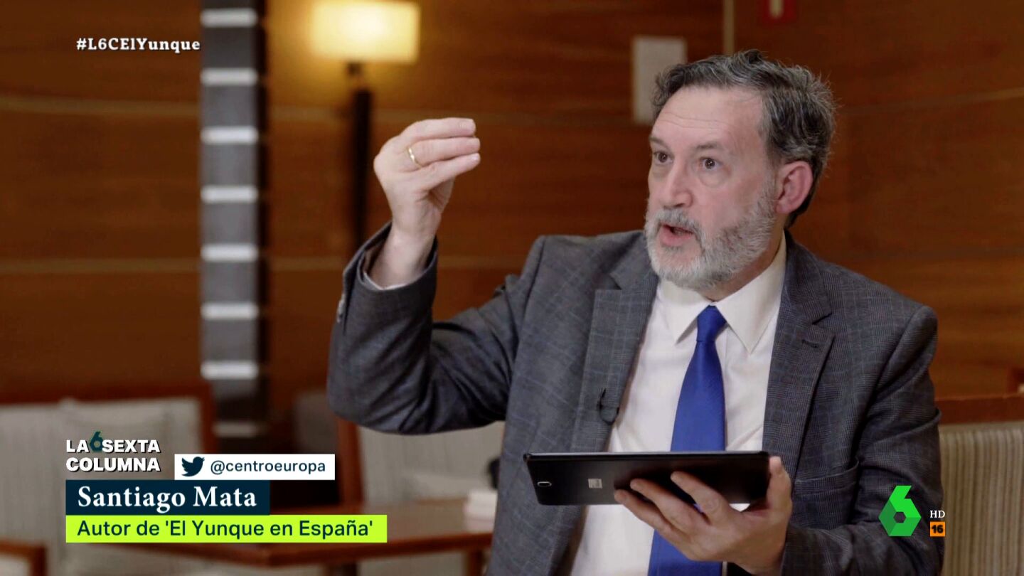 Santiago Mata es historiador, periodista y uno de los mayores expertos en España sobre 'El Yunque'. El autor de 'El Yunque en España' explica a laSexta Columna cómo funcionan sus asociaciones tapadera: "Yo he conocido a un tío que se salió de El Yunque y que estaba en la célula de Polonia Castellanos y su tapadera es Abogados Cristianos, efectivamente. Completamente, 100%, sin duda", afirma rotundo.