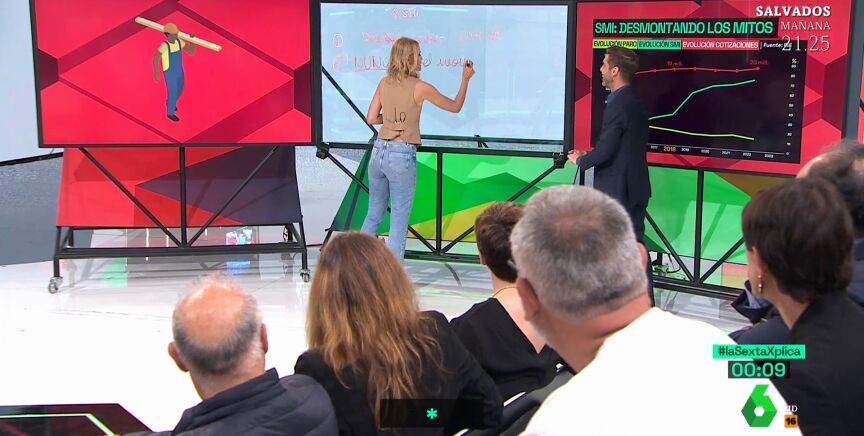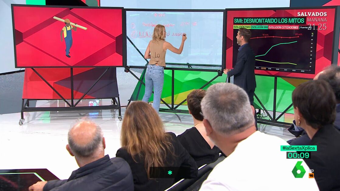 La sindicalista Afra Blanco ha utilizado la pizarra de laSexta Xplica para explicar todo lo relacionado con el Salario Mínimo Interprofesional y, de paso, desmontar mucho de los mitos generados en España durante muchos años para rechazar la subida de sueldos de trabajadores españoles. ¿Destruye empleo el incremento del SMI? ¿Existe algún buen momento para poner en práctica esta subida? ¿Se trata únicamente de una medida electoralista olvidada después de elecciones?
