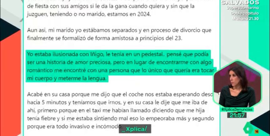 "Al final lo que preguntamos es por qué ellas no denunciaron y yo creo que simplemente viendo los comentarios que están cayendo en el muro de Elisa nos podemos hacer una idea de por qué no dan ese paso", ha expresado la periodista. Además, también ha querido recalcar que ha recibido el testimonio de dos víctimas de Íñigo Errejón las cuales describen el mismo modus operandi que uno de los testimonios que ha recogido 'elDiario.es'.