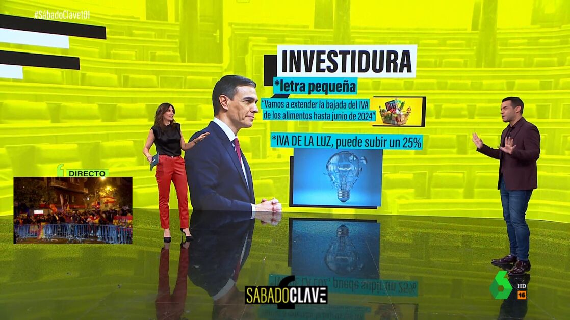 José María Camarero ha advertido en Sábado Clave de la "letra pequeña" de los anuncios del discurso de investidura de Pedro Sánchez. Respecto a la cesta de la compra, Sánchez ha dicho que van a extender la bajada del IVA de los alimentos hasta junio de 2024, algo que Camarero considera una "buena noticia". Sin embargo, ha lanzado una pregunta: "¿Qué pasa con el IVA de la luz y del gas?".