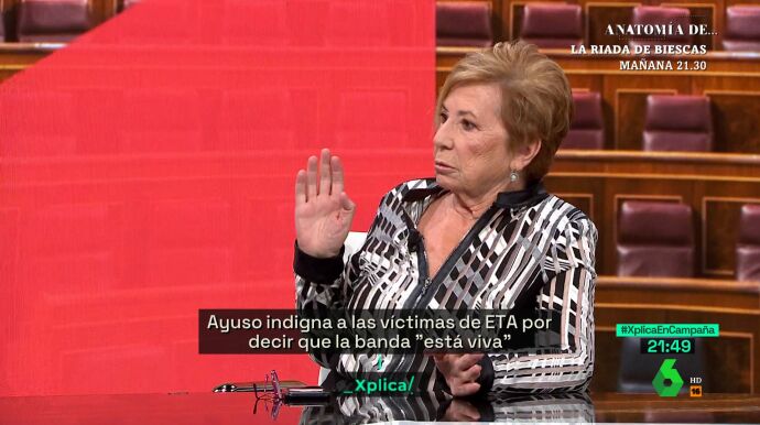Celia Villalobos, exministra de Sanidad con Aznar, ha criticado en laSexta Xplica que "todos los candidatos están hablando demasiado de ETA, incluido Sánchez". "Él dijo que jamás le daría espacio en la política a los herederos de ETA, y que jamás pactaría con esos señores. Por tanto, Ayuso tiene mucho que decir al respecto, y, por eso, tiene los respaldos electorales que tiene", ha expresado.