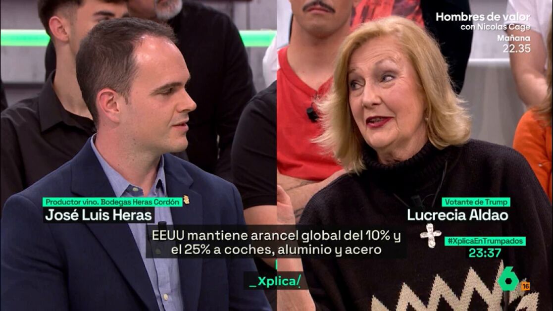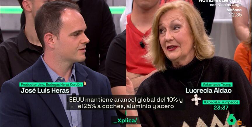 Para calmarle, Lucrecia Aldeo, estadounidense residente en España y votante de Trump, le ha dado un consejo: "Abre una oficina (en EEUU), Trump te lo agradecerá. Y es más, podéis hacer las negociaciones con él directamente. Trump es un negociante". Y, además, ha recordado que el arancel es algo que también paga en nuestro país en forma de IVA: "Tú vendes tu vino a Estados Unidos, pero cuando vendes esa botella en Madrid hay que pagar el 21%".