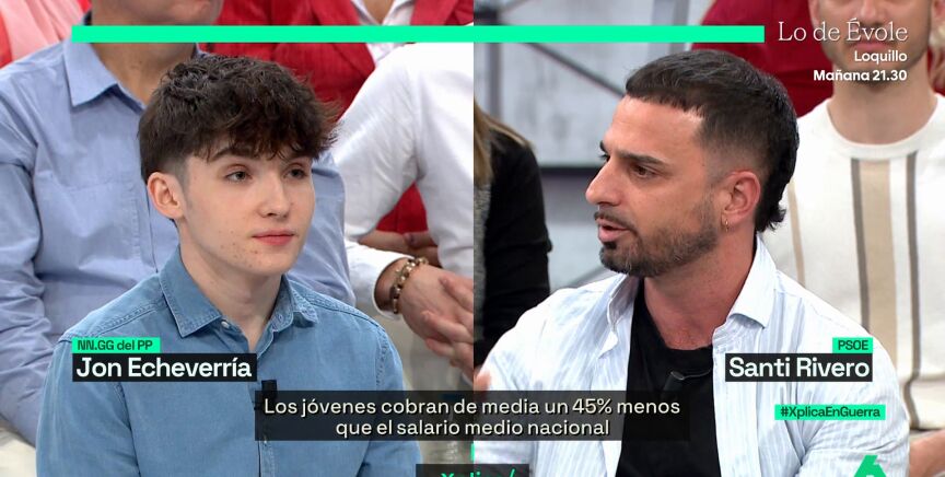 "Los impuestos salvan vidas, porque curan los cánceres, pagan a los militares, pagan cuando hay que hacer un ERTE, pagan nuestras carreteras, cuando alguien se queda en paro, a nuestros profesores y nuestros sanitarios", defiende Rivero mientras Echevarría niega que alguien esté diciendo lo contrario. "Pero también es verdad que el pago de impuestos de lo que renegamos es, por ejemplo, de los 60 mil millones de euros de gasto improductivo de la administración pública", esgrime el joven de NNGG. "¿Como el asesor de Ayuso que le busca piso?", responde Rivero. Echevarría contraataca con Begoña Gómez.