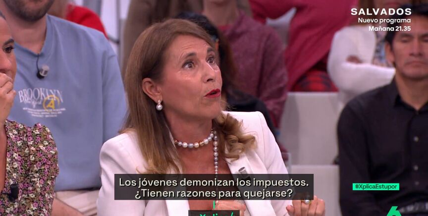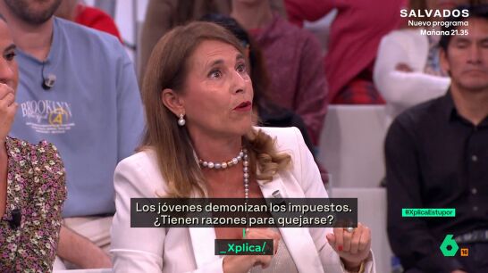 "Los impuestos hay que pagarlos aquí y se han de pagar racionalmente", defiende María José Tarancón, economista, en laSexta Xplica. El programa de debate pone sobre la mesa una cuestión: ¿existe hoy en España un furor antiimpuestos? Cada vez más, los jóvenes demonizan los impuestos. Pero, ¿tienen razones para quejarse?