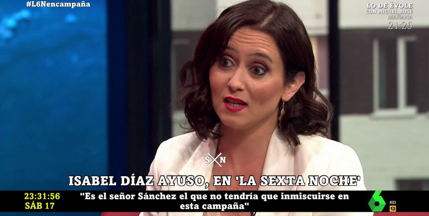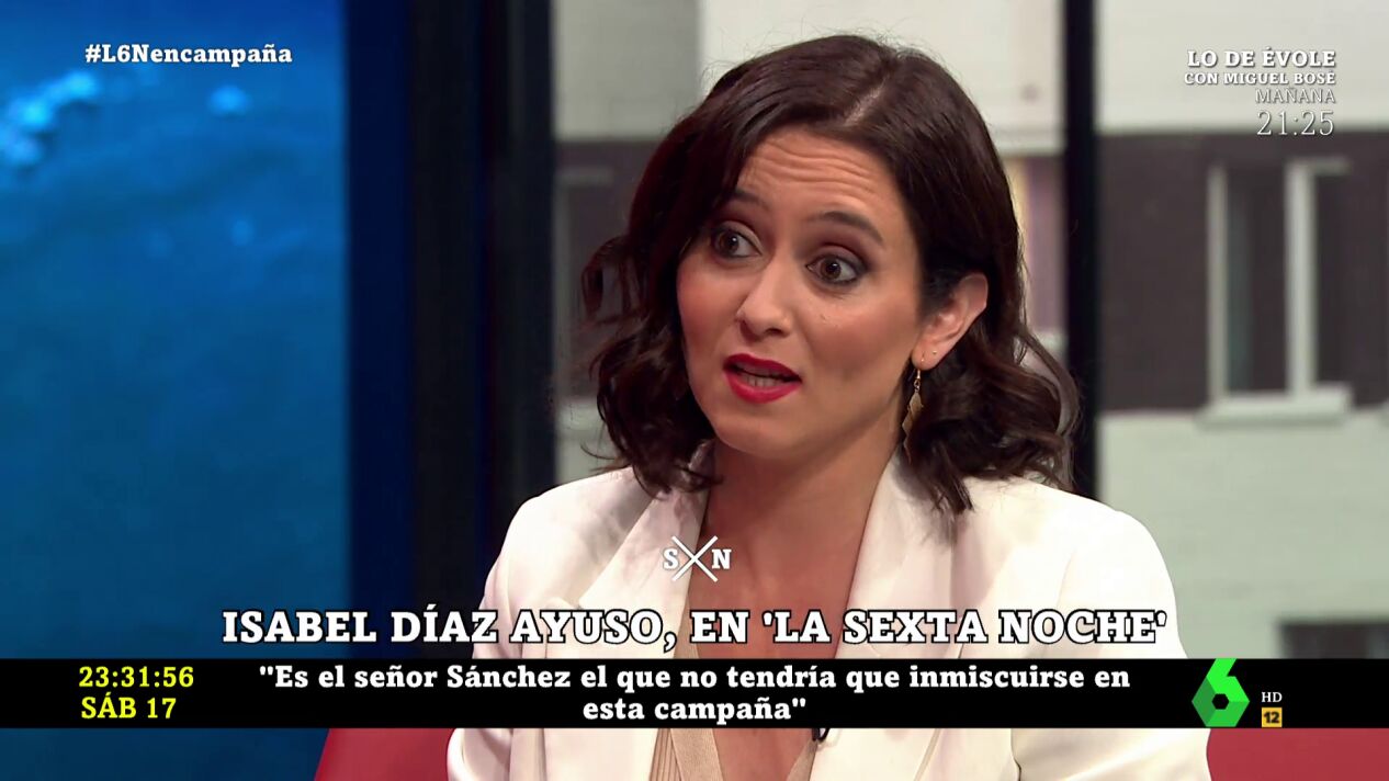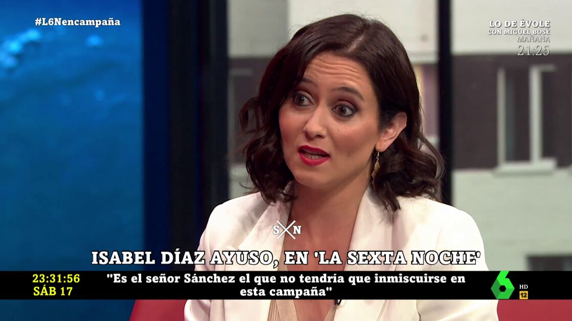 La presidenta madrileña sostiene que Sánchez "no tendría que estar inmiscuyéndose" en la campaña electoral y afirma que "el que queda desdibujado es precisamente su candidato".