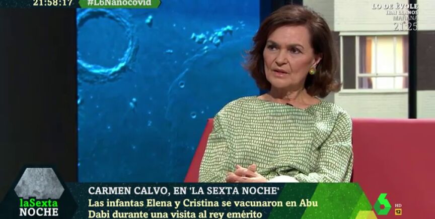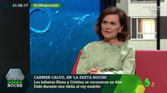 ¿Qué valoración hacen desde el Gobierno de la vacunación de las infantas Cristina y Elena en Abu Dabi durante el viaje que realizaron para visitar a su padre, Juan Carlos I? Es la pregunta que Iñaki López ha lanzado en laSexta Noche a Carmen Calvo. La vicepresidenta primera del Gobierno ha respondido de forma tajante: "No es entendible y no es aceptable de ninguna manera que esto haya ocurrido".