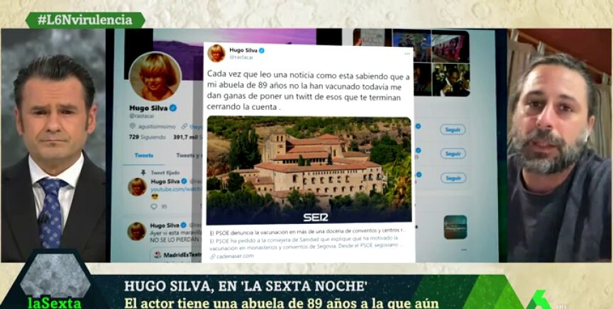 El actor Hugo Silva ha vuelto a mostrar su enfado con aquellos que se "cuelan" en la vacunación, algo que ya expresó en su cuenta de Twitter, donde compartió la noticia de la vacunación en monasterios y conventos de Segovia y manifestó: "Cada vez que leo una noticia como esta sabiendo que a mi abuela de 89 años no la han vacunado todavía, me dan ganas de poner un tuit de esos que te terminan cerrando la cuenta.