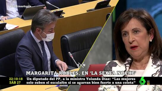 Margarita Robles ha expresado sentir "una enorme vergüenza" ante el ataque machista de un diputado del PP a Yolanda Díaz. "Personas que hacen esos comentarios no merecen estar en política. Es una falta de respeto no solo a la ministra Yolanda Díaz, sino a todas las mujeres. Yo me siento absolutamente ofendida por este tema", ha manifestado.