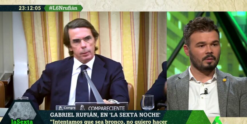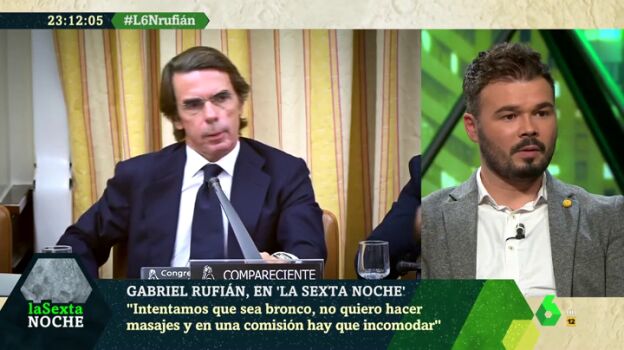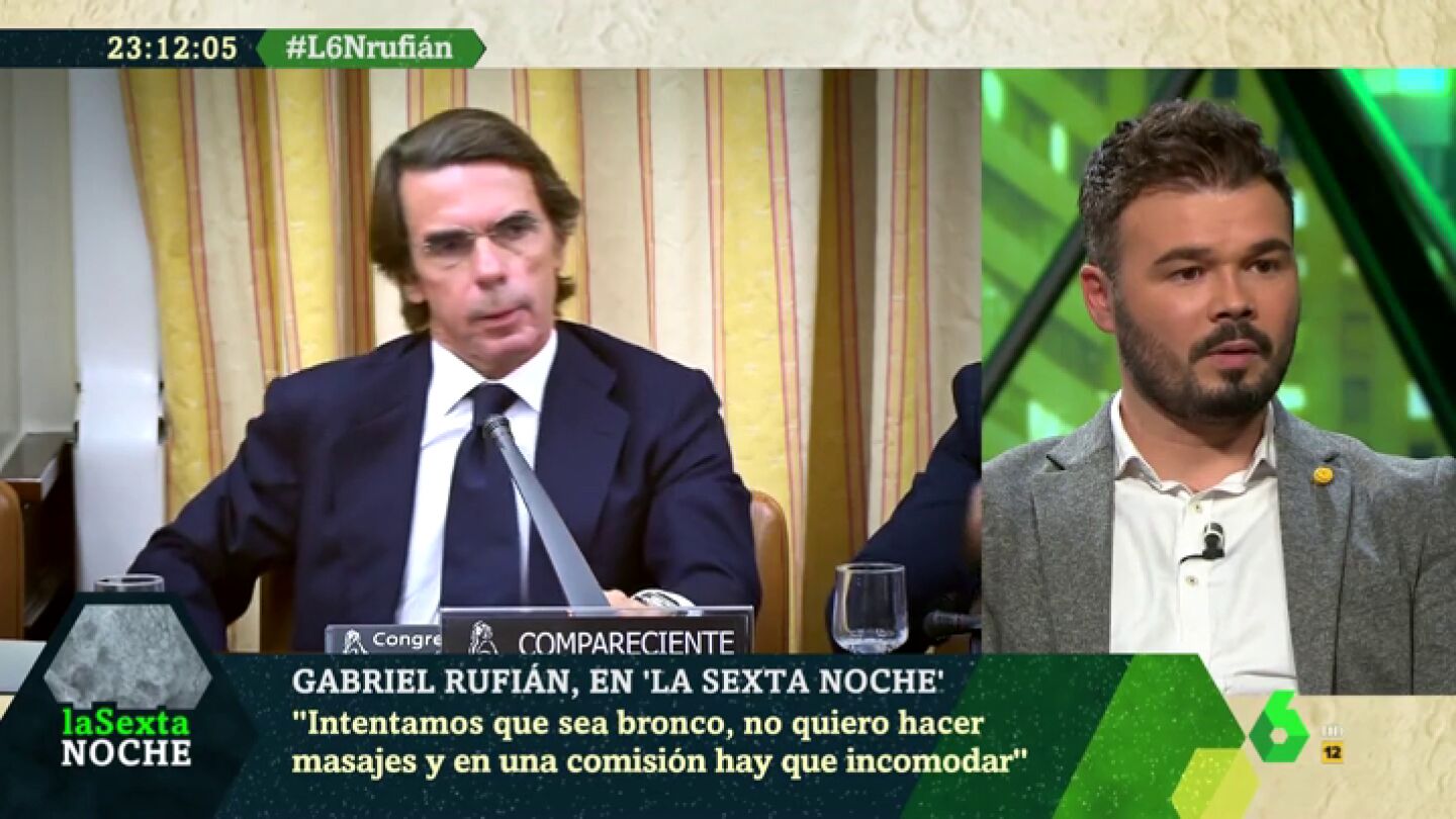 Después de repasar algunas de sus más sonadas polémicas en el Congreso, el diputado de ERC Gabriel Rufián ha dicho en laSexta Noche que "legalmente las comisiones de investigación no sirven". Sin embargo, ha destacado que en casos como el de Aznar y la guerra de Irak, "hay gente que lo ve y se conciencia, vote a quien vote, de que es una barbaridad".