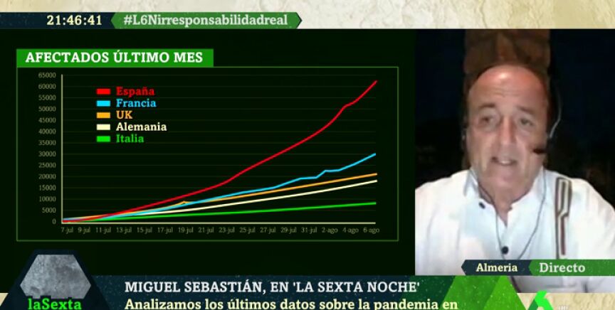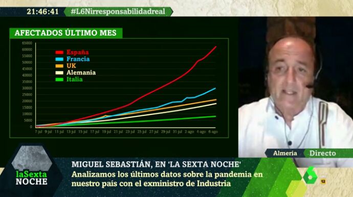 El exministro de Industria ha afirmado que la situación del coronavirus en España "no va bien". "Seguimos en una curva exponencial y hay un gráfico que me preocupa todavía más que es la comparación en el último mes (del 7 de julio al 7 de agosto). En Italia han habido 7.800 casos nuevos y en España 62.000. Es evidente que tenemos un problema serio", ha afirmado.