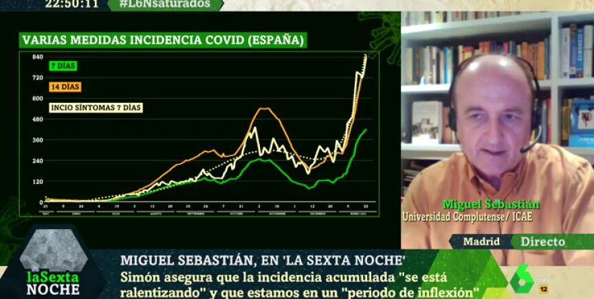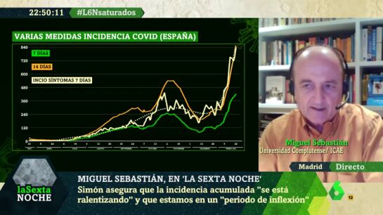 Miguel Sebastián ha pedido a los responsables de la gestión de la pandemia en España que se fijen en las estadísticas para entender cómo actuar frente a la crisis sanitaria: "Los gráficos no dicen que estemos en el pico, ni cerca de él". En este sentido, cree que tendremos que esperar "dos semanas para que ya veamos la curva bajar y podamos decir que se ha alcanzado un pico".