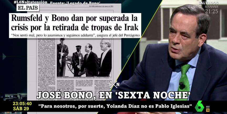Recordando la retirada de las tropas españolas de Irak, José Bono desvela en laSexta Noche cómo fue su primera llamada con su homólogo en Estados Unidos cuando pisó el Ministerio de Defensa.