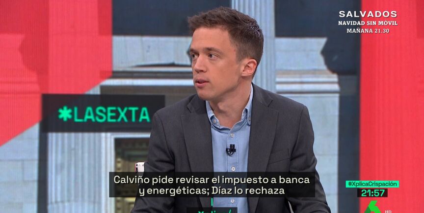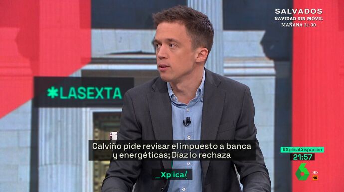 Íñigo Errejón visita el plató de laSexta Xplica para hablar de la revisión que Nadia Calviño ha pedido para el impuesto de la banca y de las energéticas, y que Pedro Sánchez ha apoyado. "Son dos sectores a los que les está yendo muy bien y a los que se les puede pedir solidaridad", porque "luego son los primeros que se ponen a la cola para recibir ayudas públicas", como, por ejemplo, los fondos europeos.