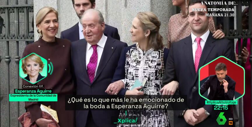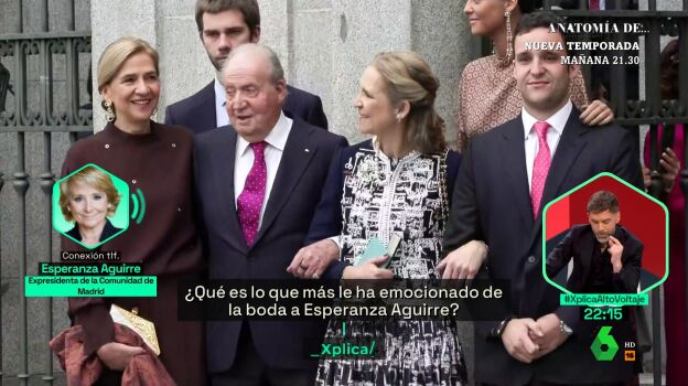 Un rey emérito que no ha bailado en la fiesta, tal y como ha confesado Esperanza Aguirre en laSexta Xplica: "Han puesto el himno nacional y ha sido emocionante también ver al emérito. No ha bailado, no está en 'modo bailes'".
