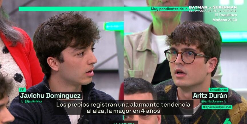Aritz Durán respondió en laSexta Xplica a Javi Domínguez, quien criticó que las medidas anticrisis del Gobierno habían llegado tarde. "Lo que ha llegado tarde es el 'no' a la guerra por parte del Partido Popular", expresó el estudiante.