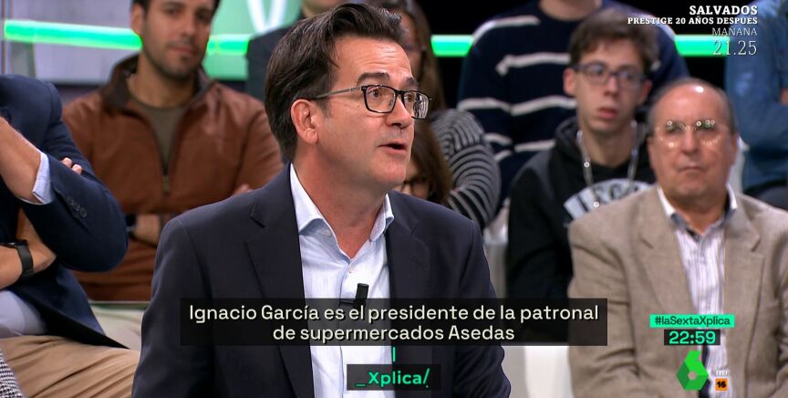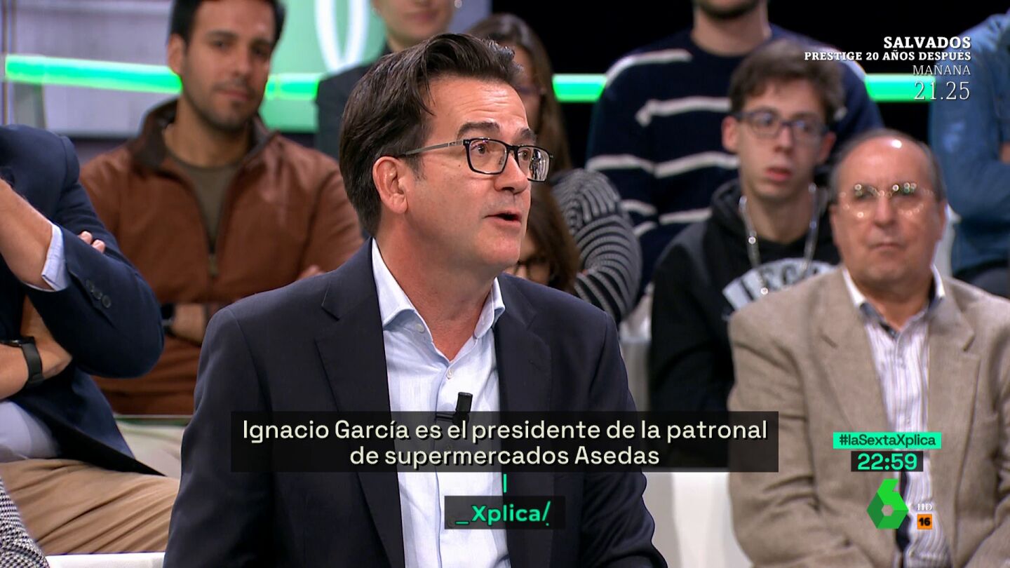 Ignacio García Magazo, presidente de la Patronal de supermercados Asedas, ha explicado en laSexta Xplica a qué se debe la subida de precios que se está registrando en los alimentos. El dirigente ha negado que se esté dando un enriquecimiento de las grandes superficie, asegurando que España cuenta con "una de las distribuciones comerciales más competitivas de Europa y del mundo", y ha añadido: "Al contrario que en otros países, aquí hay más empresas y formatos, y todos como consumidores tenemos la capacidad de elegir".