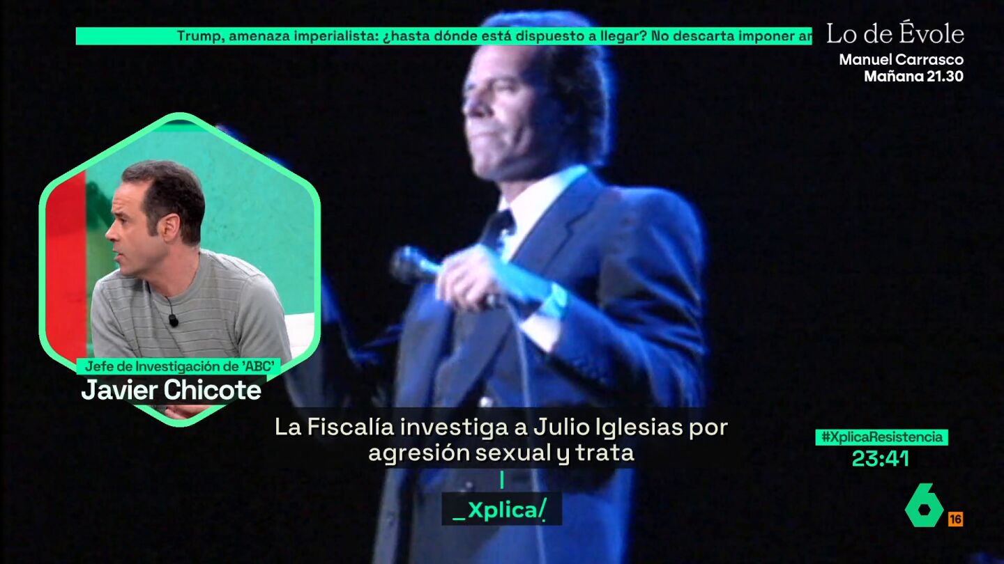 Javier Chicote, jefe de investigación de 'ABC', ha reaccionado en laSexta Xplica a las denuncias contra Julio Iglesias por presuntas agresiones sexuales y ha expresado que él considera "un error politizar absolutamente todo". Se han hablado de dos casos que son absolutamente distintos, el de Julio Iglesias y el de Paco Salazar, porque Paco Salazar es un alto cargo de un partido y le denuncian mujeres de ese partido, por lo que es un problema eminentemente político porque ocurre en el seno de un partido", ha destacado.