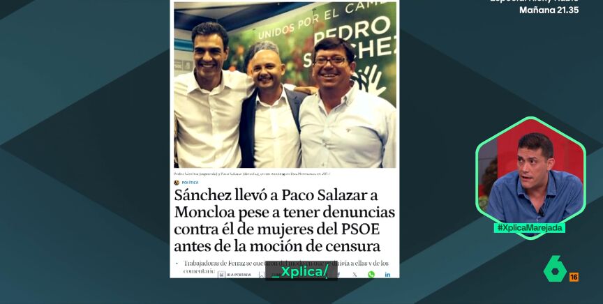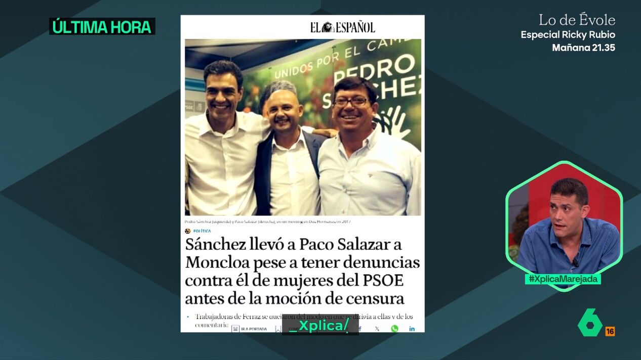 Jorge Calabrés, jefe de Investigación de 'El Español', ha hablado en laSexta Xplica sobre una información que publica el medio en el que trabaja, cuyo titular es que "Pedro Sánchez llevó a Paco Salazar a Moncloa pese a tener denuncias contra él de mujeres del PSOE antes de la moción de censura".