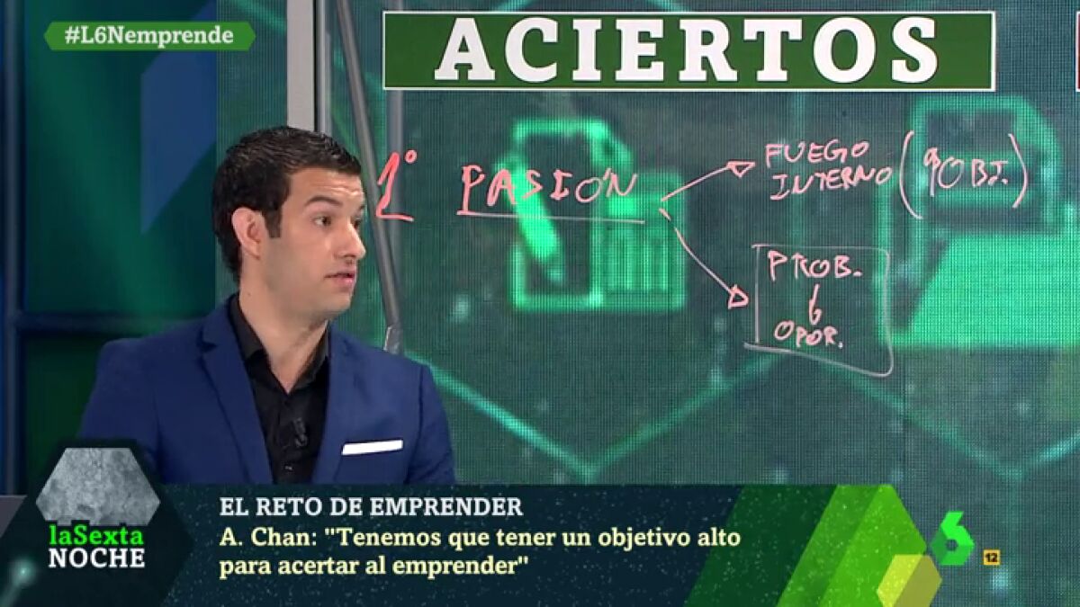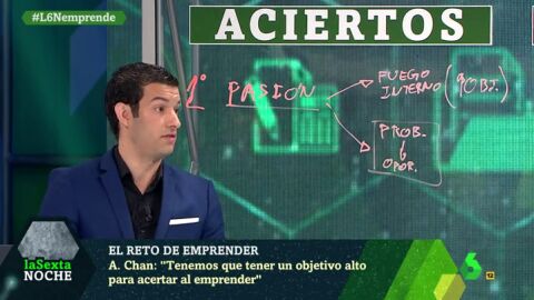 Alberto Chan explica en laSexta Noche cuáles son los aciertos y errores que comete elemprendedor. Chan recuerda que el emprendedor tiene que convertir los problemas en oportunidades. "Tenemos que tener un objetivo alto para acertar al emprender", añade.